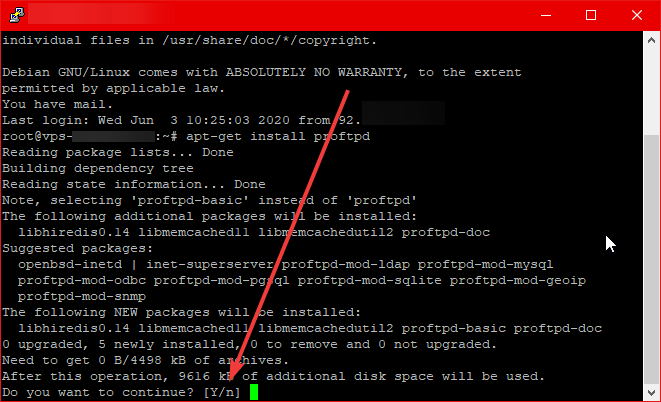 To install the FTP server now, enter the following apt-get install proftpd. You have to confirm the request with a Y and enter: