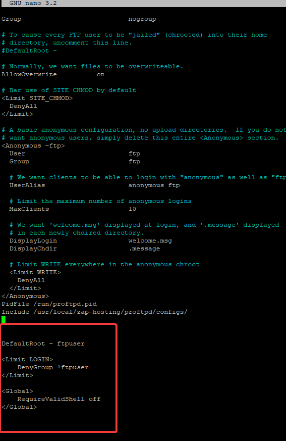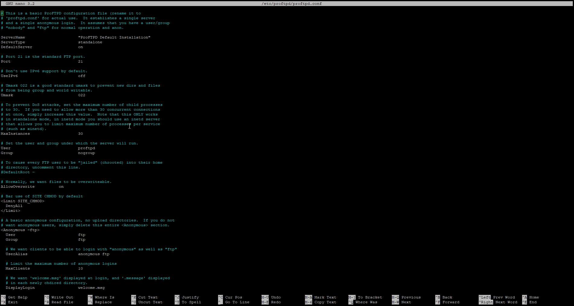 Now we still have to adjust the config. For this we enter the following nano /etc/proftpd/proftpd.conf and confirm. Afterwards the config file is opened in the Nanoeditor: