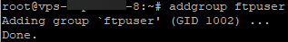 To create the new FTP user, we first have to create an FTP group. We do this with the command addgroup ftpuser. This will look like this: