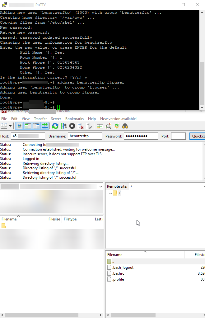 Now we can add our first FTP user with the commands: adduser benutzerftp -shell /bin/false -home /var/www and then adduser benutzerftp ftpuser.