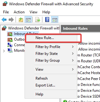 Right Click on "Inbound Rules" and Select "New Rule" :